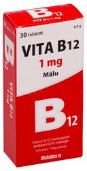 Vitamiin B12 aitab kaasa normaalsetele psühholoogilistele funktsioonidele, stimuleerib vereloomet ning aitab vähendada väsimust ja kurnatust. B12-vitamiini vajadus on suurenenud veganitel ja teatud ravimite kasutamisel. B12-vitamiin imendub hästi suu limaskestalt, eriti kui annused on kõrged. Vita B12-imemistabletti tuleb suus aeglaselt lasta sulada, et tagada parem imendumine. Annustamine: Täiskasvanutele 1 imemistablett päevas, lasta aeglaselt suus sulada. Ei sobi lastele. Päevane annus 1 imemistablett sisaldab: B12-vitamiini 1 mg (1000 µg) -40 000%*. *- protsent päevasest võrdluskogusest täiskasvanutele. Abiained: magusaine (ksülitool), emulgaator (rasvhapete magneesiumisoolad), tsüanokobalamiin (vitamiin B12), lõhna- ja maitseaine (aedpiparmündiõli).